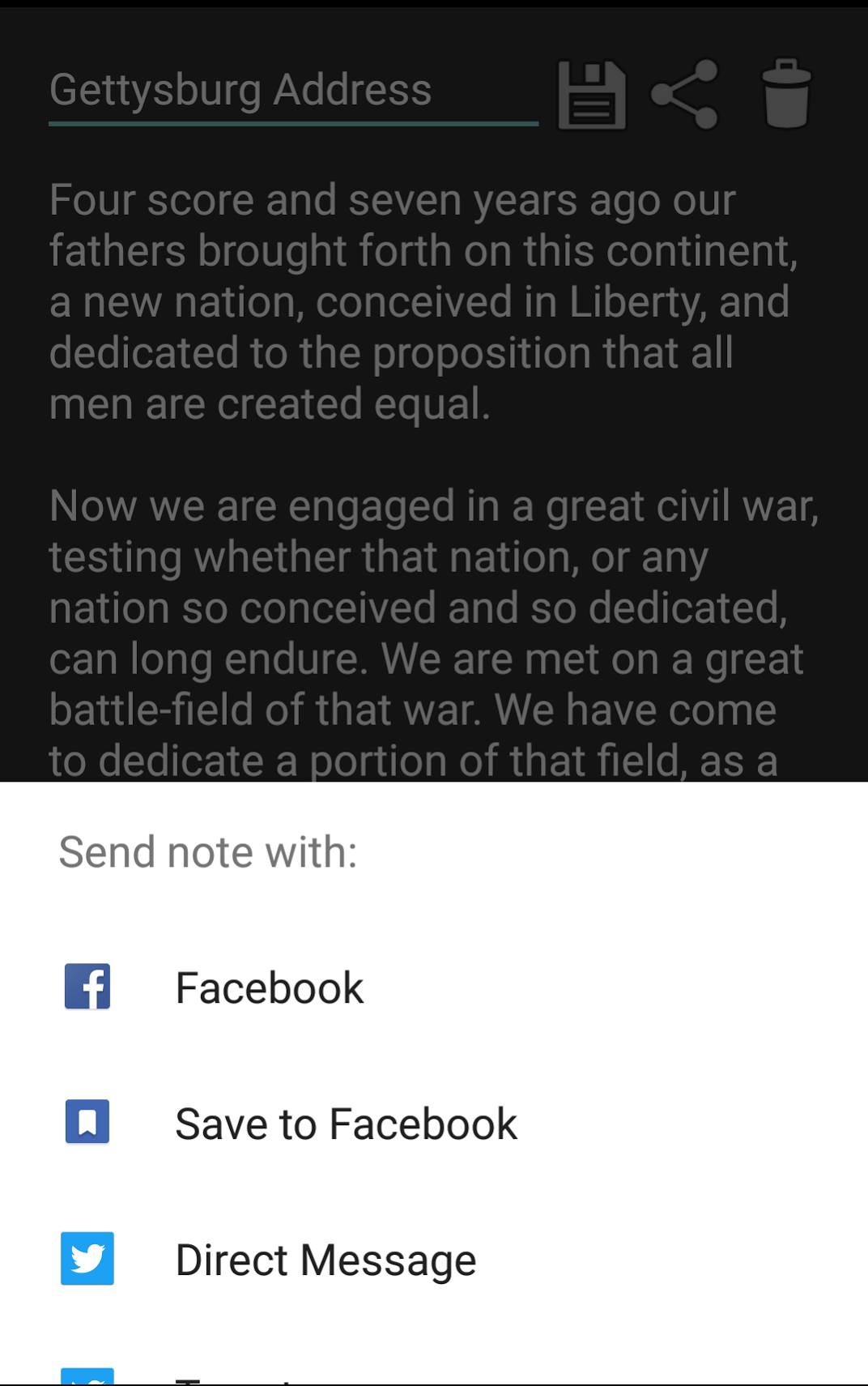 Below are some screenshots taken from the NotePad app. They show its interface and functions, starting with the main page and going through the steps of making, working on, saving, sharing, and deleting a note.